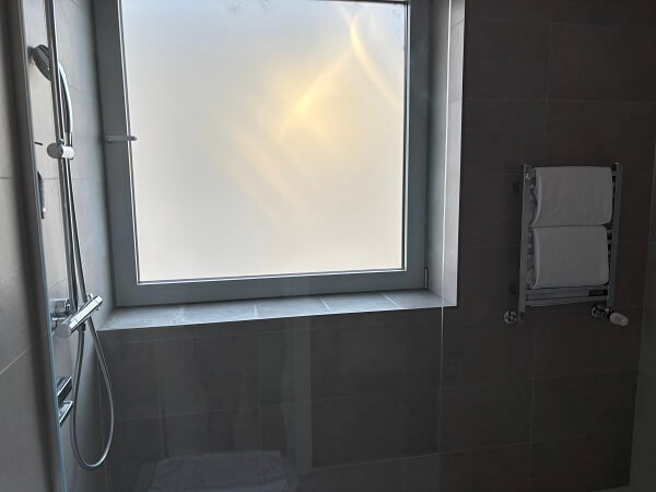Premier Hotel MiskolcのClassic Double Roomのシャワー室大きなすりガラスの窓とタオル乾燥ラック