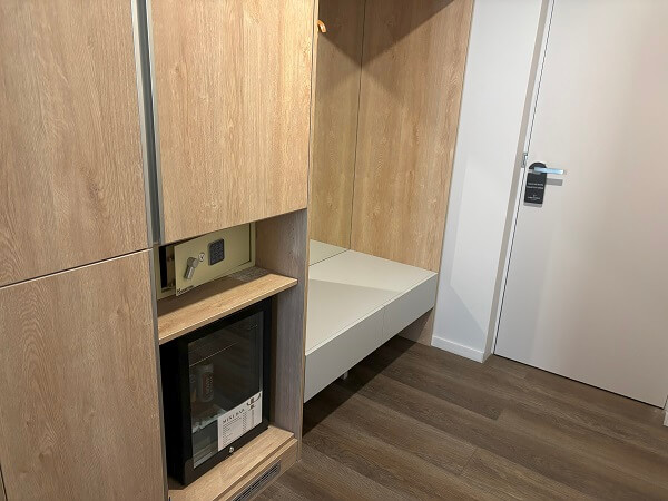Premier Hotel MiskolcのClassic Double Roomの入口付近にある金庫・クローゼット・ミニバー