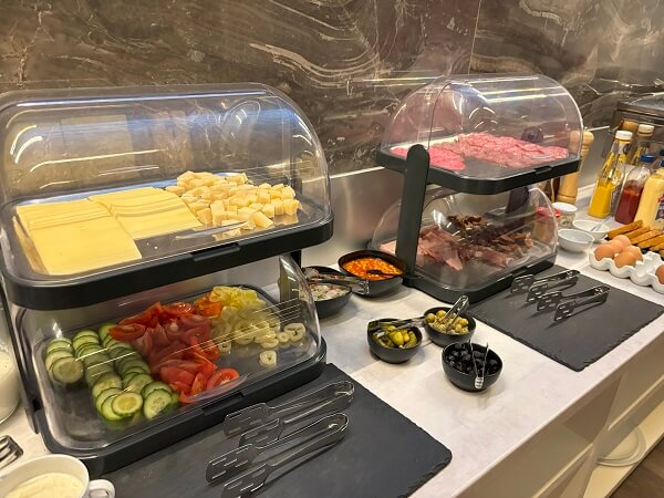 Premier Hotel Miskolcの朝食例:チーズ・ハム・サラミ・きゅうり・トマトなど