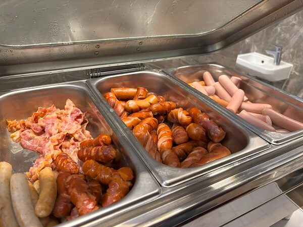 Premier Hotel Miskolcの朝食例:ベーコンやソーセージ